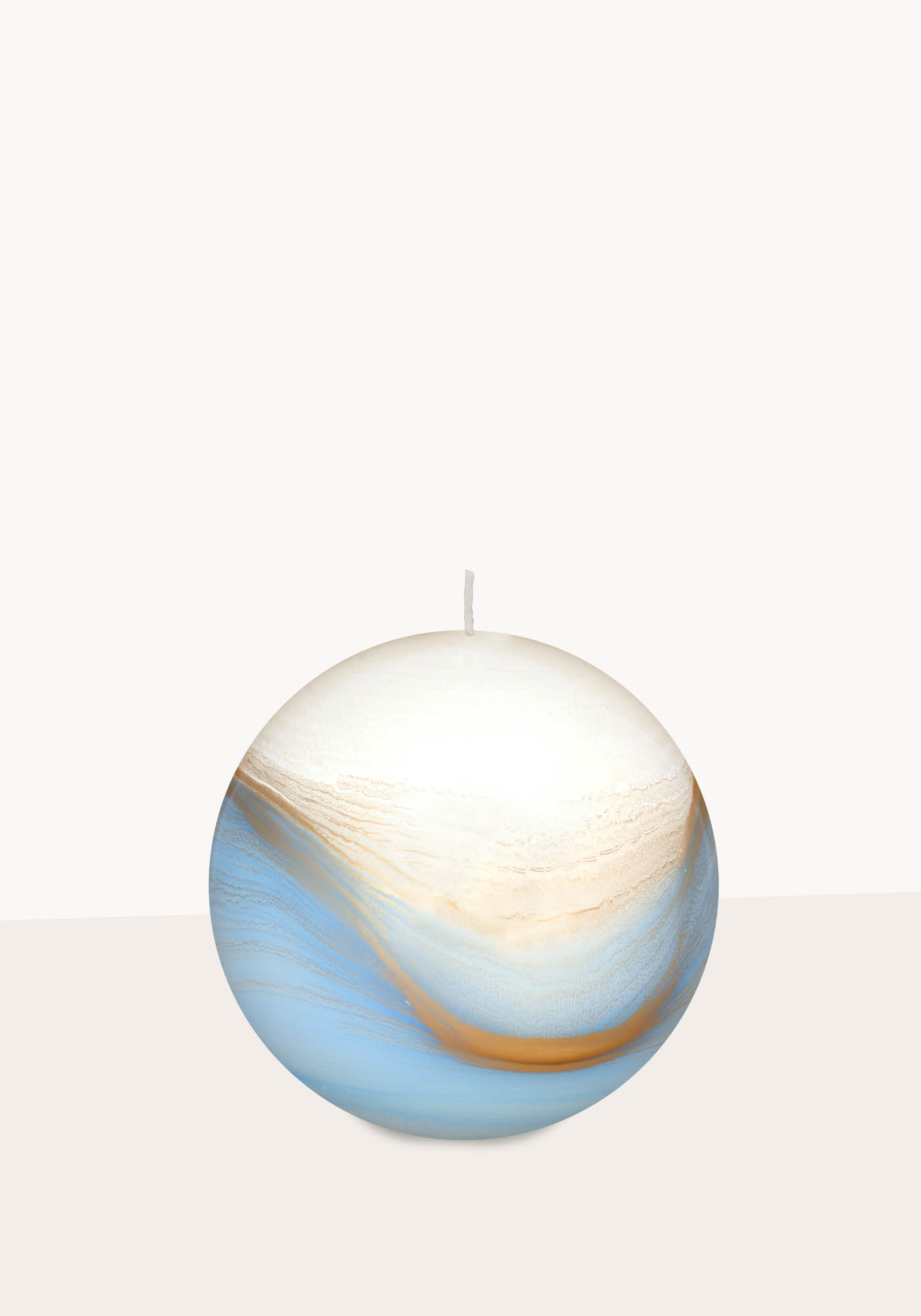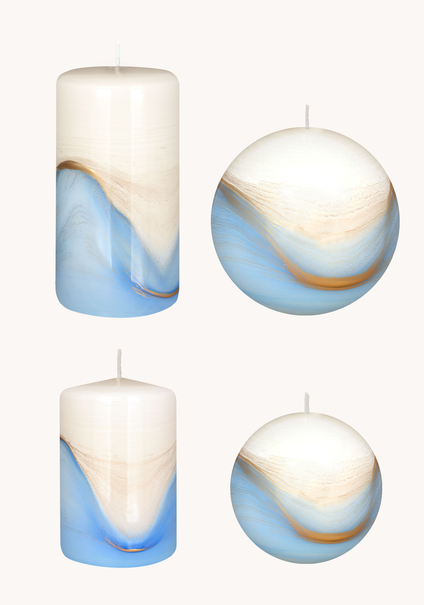 Die Serie umfasst 2 Kugelkerzen in den Größen 8, 10 cm Ø, 2 Stumpenkerzen in den Größen 10 x 7 und 14 x 7 cm.