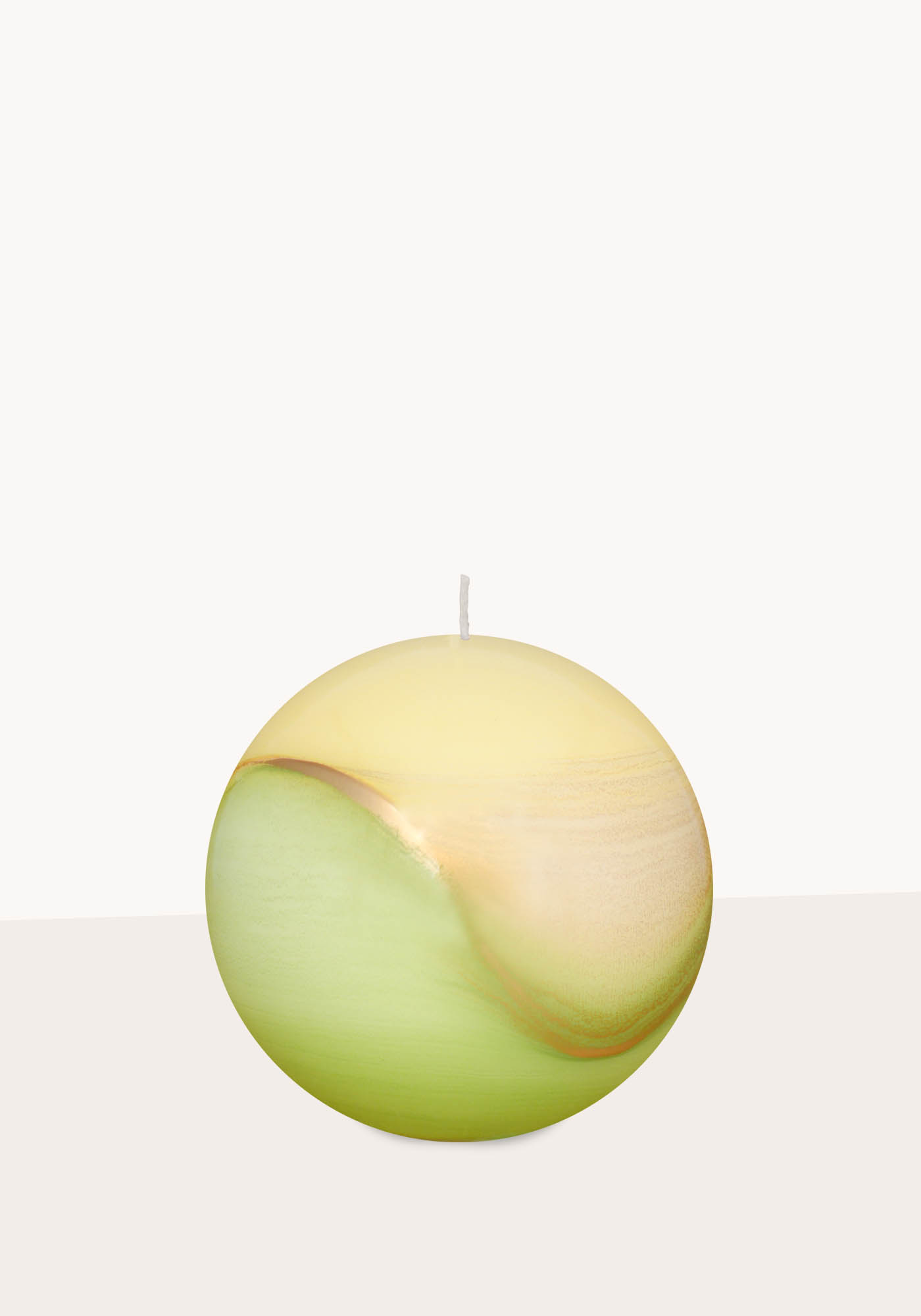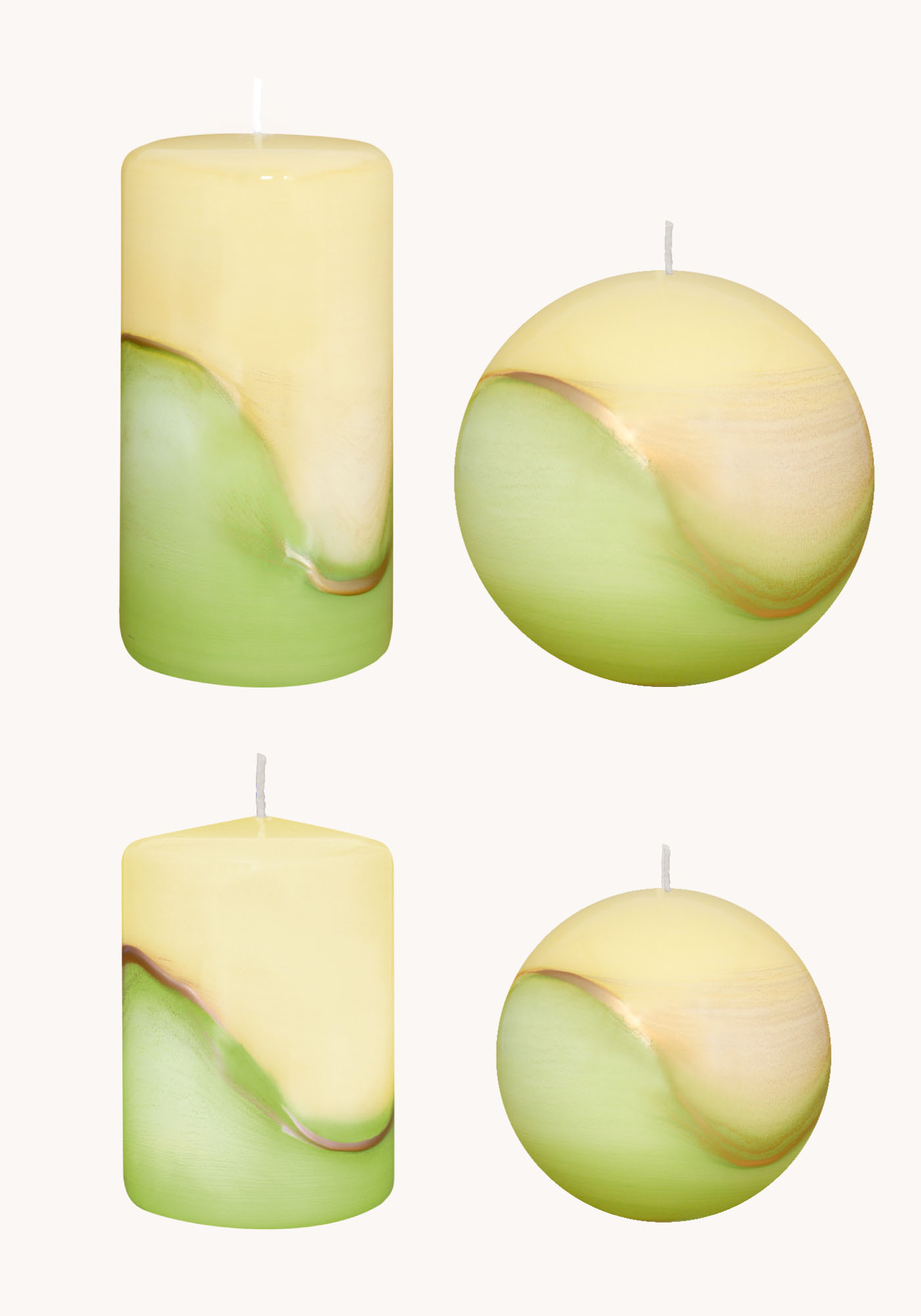 Die Serie umfasst 2 Kugelkerzen in den Größen 8, 10 cm Ø, 2 Stumpenkerzen in den Größen 10 x 7 und 14 x 7 cm.
