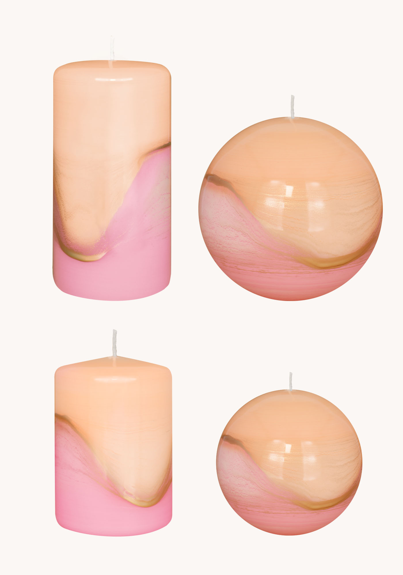 Die Serie umfasst 2 Kugelkerzen in den Größen 8 und 10 Ø, 2 Stumpenkerzen in den Größen 10 x 7 und 14 x 7 cm.