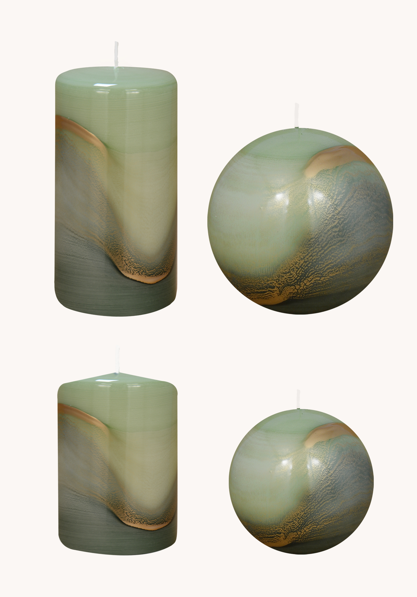 Die Serie umfasst 3 Kugelkerzen in den Größen 8, 10 und 12 cm Ø, 2 Stumpenkerzen in den Größen 10 x 7 und 14 x 7 cm, 2 Ovalkerzen in den Größen 13 x 9 und 18 x 9 cm sowie ein Stabkerzen 4er-Set in der Größe 25 x 2,2 cm.