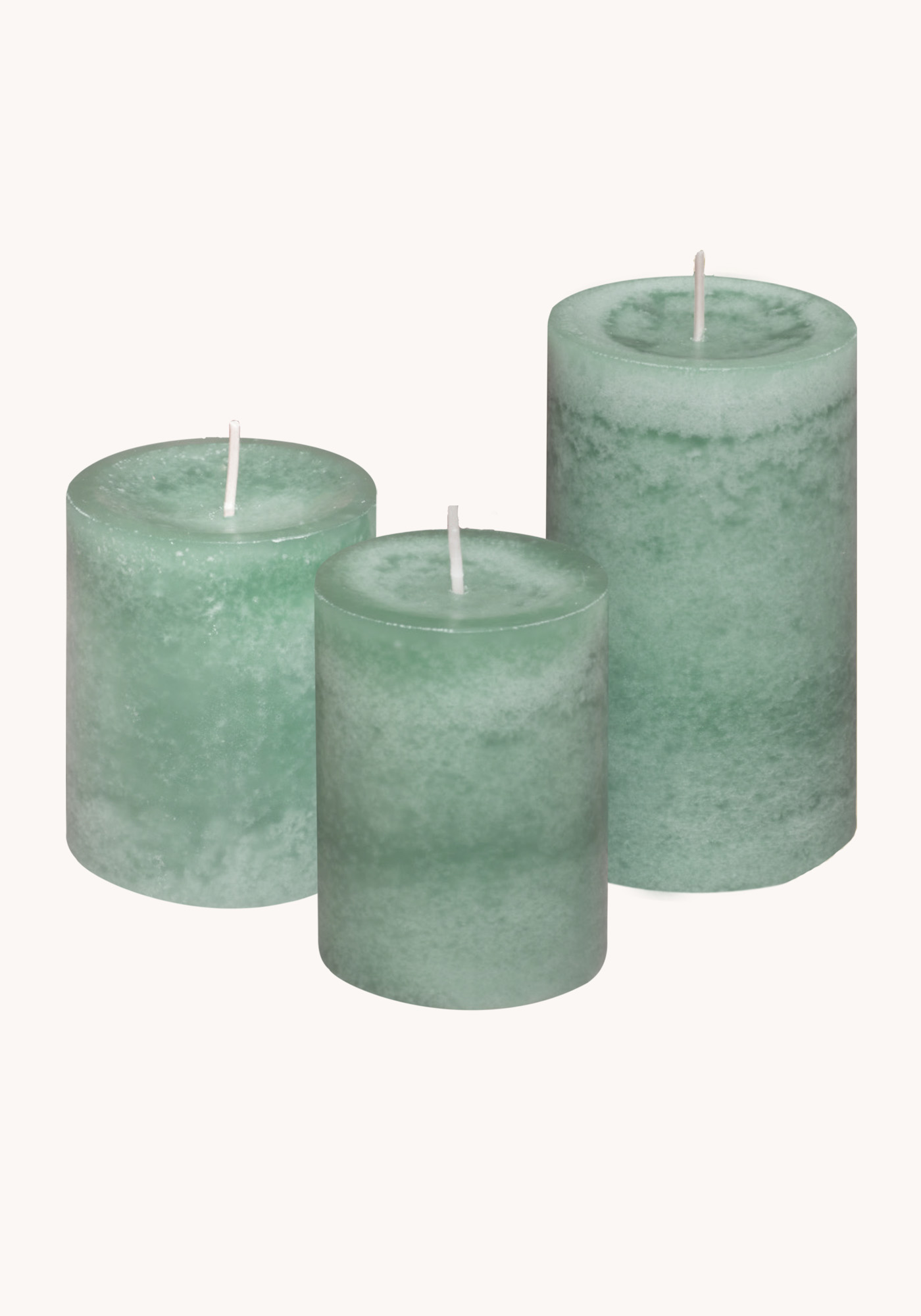 Die Serie umfasst 3 Stumpenkerzen in der Größe 9x6, 9x7 cm und 13x7 cm.