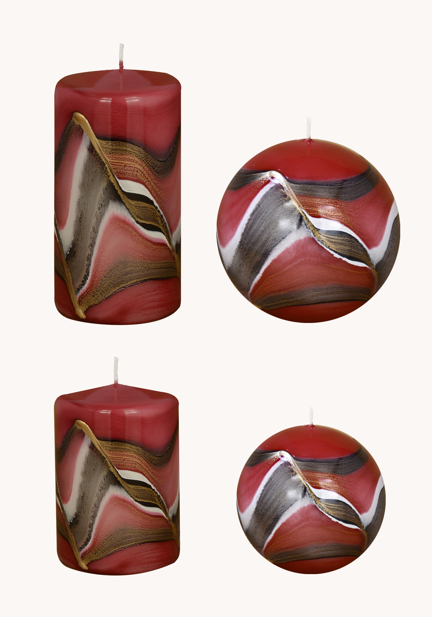Die Designs sind bis ins Detail perfekt herausgearbeitet und werden erst durch mehrere unterschiedliche Arbeitsgänge und Techniken besonders ausdrucksstark. So werden die Kerzen zu echten "Hinguckern", ja fast zu Design-Objekten. Zum Abschluss werden die Kerzen mit einem speziellen Kerzenlack hauchdünn überzogen: Schutz, aber auch Verstärkung der Farben und Vollendung in der Wirkung. Die Kerzen werden einzeln in Cellophantüten verpackt.