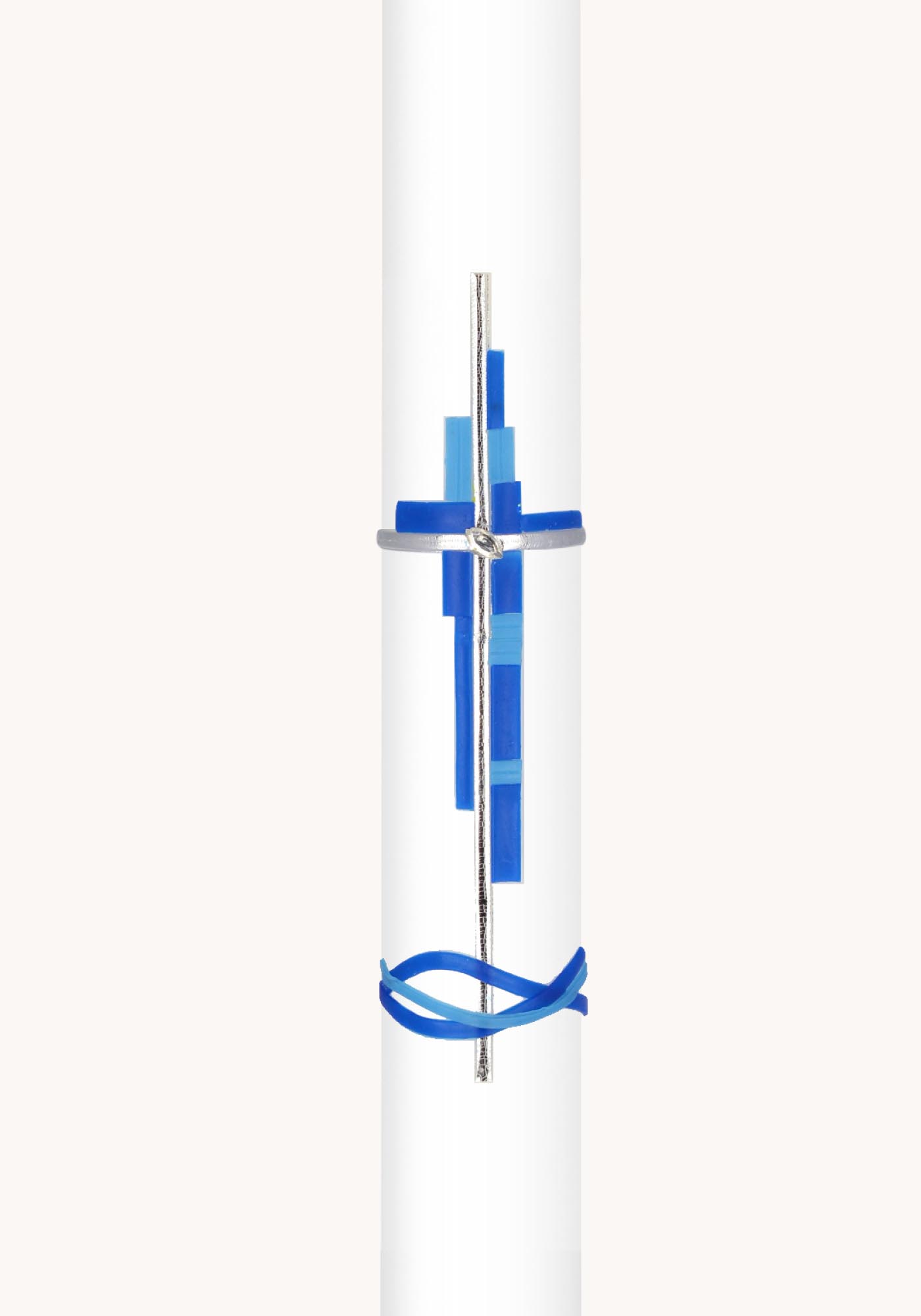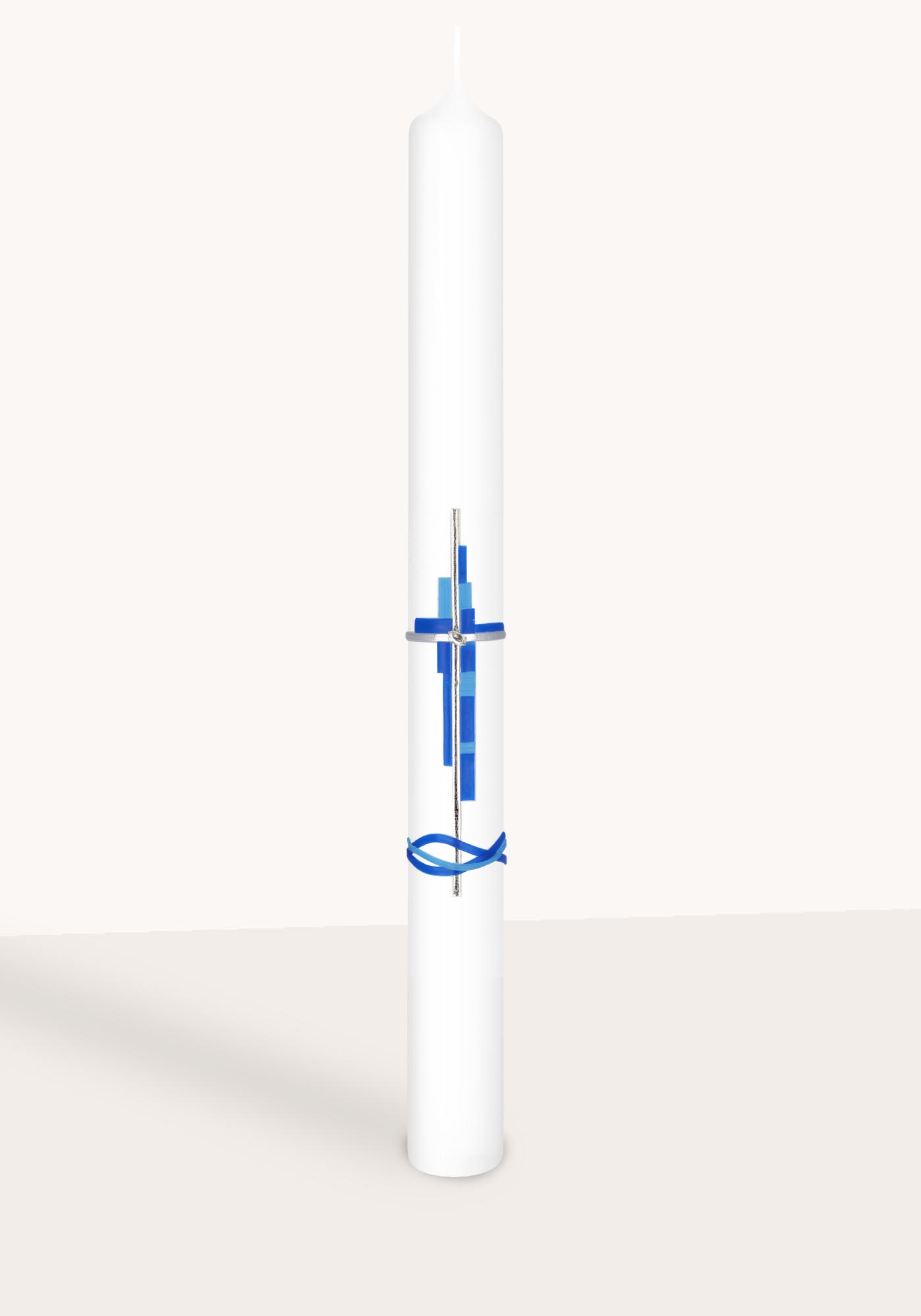 Kommunionkerze Motiv "Blau-silbernes Wachskreuz mit Fisch" soll das Kommunionkind ein Leben lang begleiten.