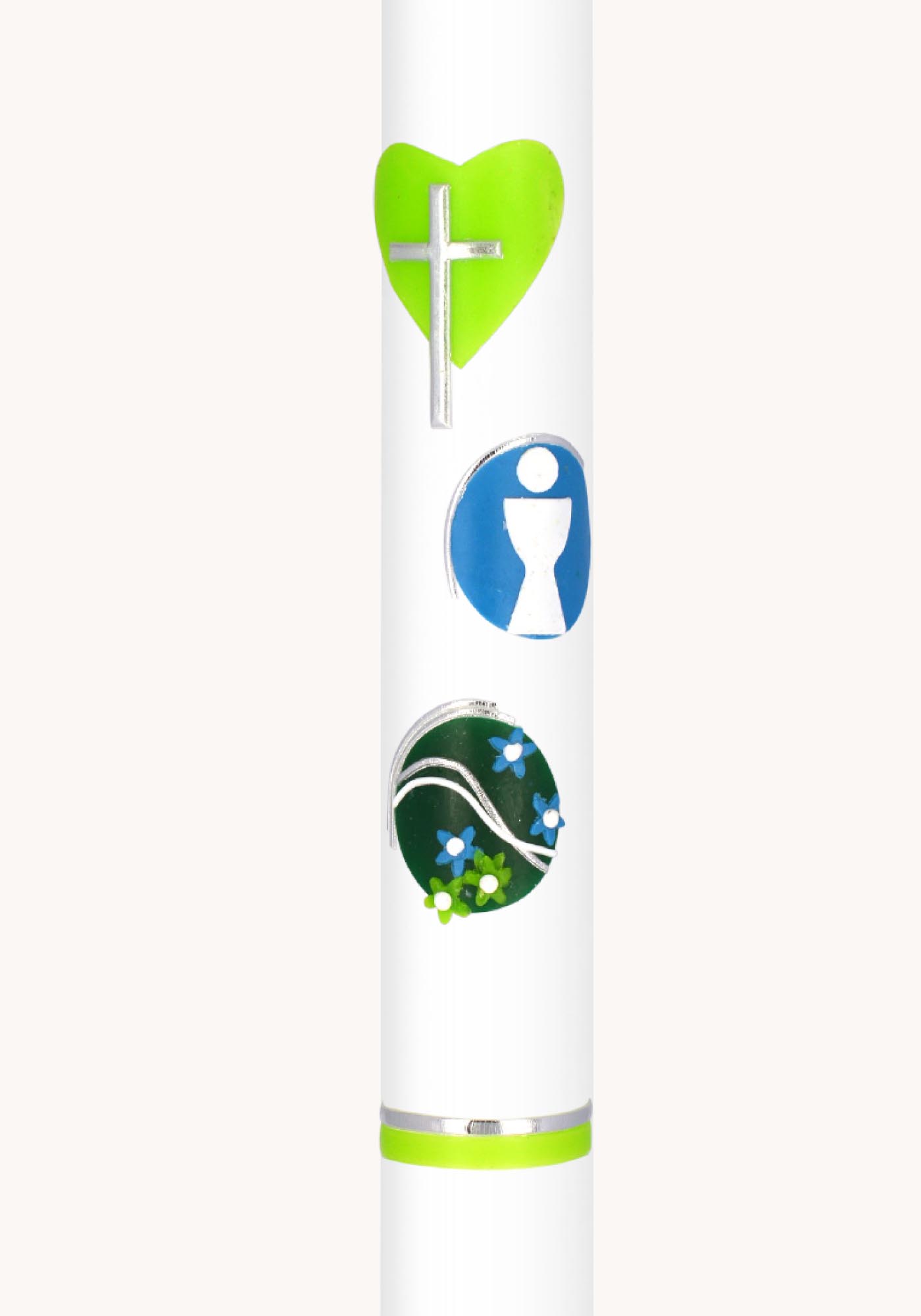 Kommunionkerze Motiv "Bunte Wachssymbole - Herz, Kelch, Blüten" soll das Kommunionkind ein Leben lang begleiten.