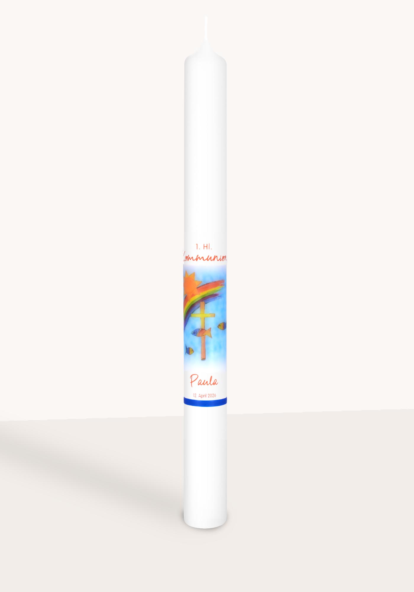 Kommunionkerze Motiv "Regenbogen, Fische und Kreuz" soll das Kommunionkind ein Leben lang begleiten.