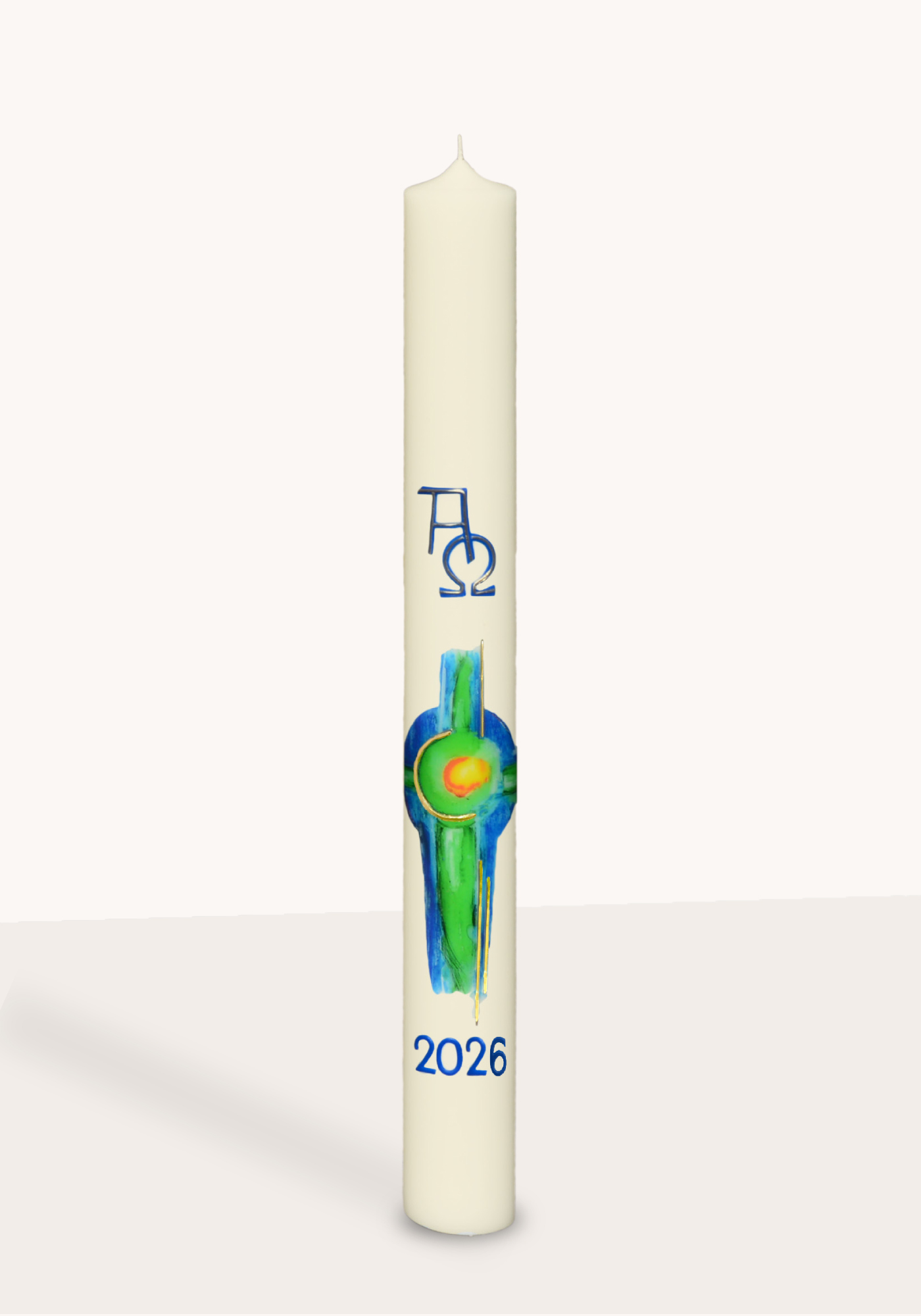Das Transferbild, grün/blaues modernes Kreuz, ist von dem firmeneigenen Künstler gemalt worden. Alle Wachselemente sind von Hand aufgelegt worden.
