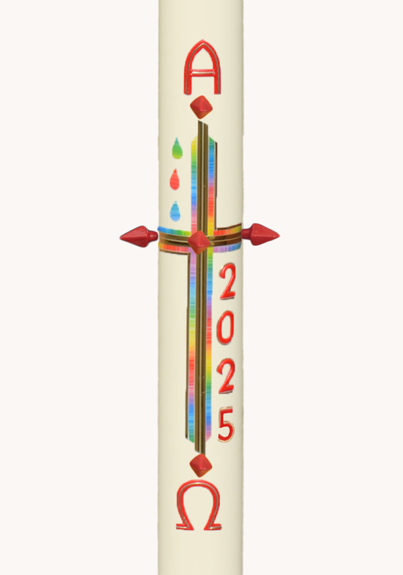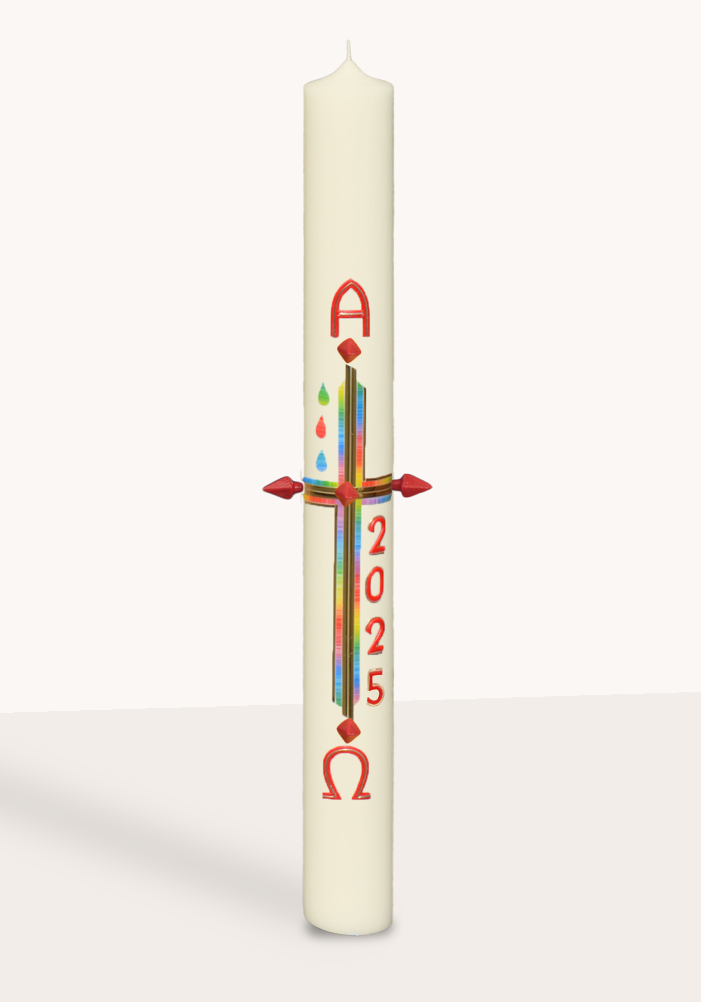 Das Motiv der Osterkerze ist verziert mit vielen Wachselementen in regenbogenfarben, gold und rot.