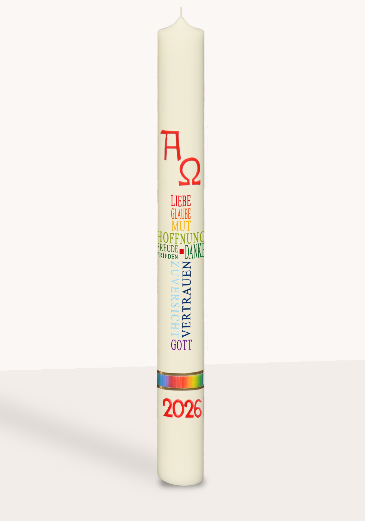 Osterkerze "Liebe, Glaube, Mut, Regenbogenabschlussband" 287