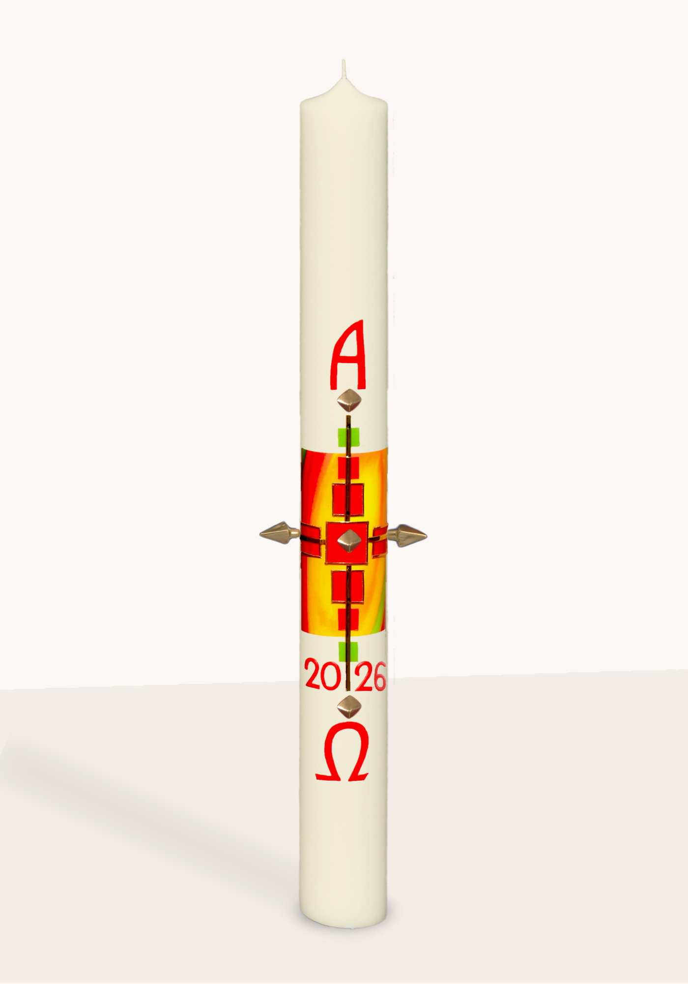 Das Motiv unserer Osterkerze besticht durch einen modernen, abstrakten Hintergrund, handgemalt und im Transferdruck auf die Kerze gebracht. Die aufwändigen Wachselemente farblich dazu abgestimmt werden von Hand aufgelegt.