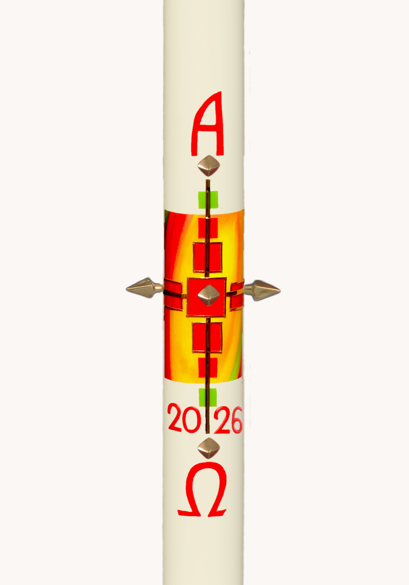 Unsere eigenen Künstler verbinden Liturgie, Glaubensbotschaften und aktuelle Themen zu künstlerisch anspruchsvollen Ornamenten auf dieser Osterkerze.