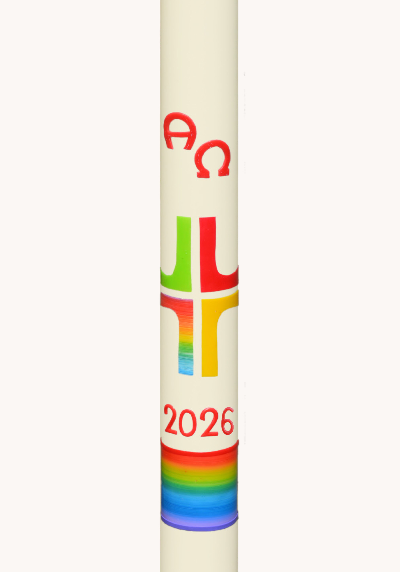 Das Motiv aus farbenfrohen Wachselementen gestaltet als Botschaftsträger des Regenbogens sowohl Kreuz als auch Abschlussband modern aus. Die roten ΑΩ-Symbole und Jahreszahlen vollenden das christliche Design.