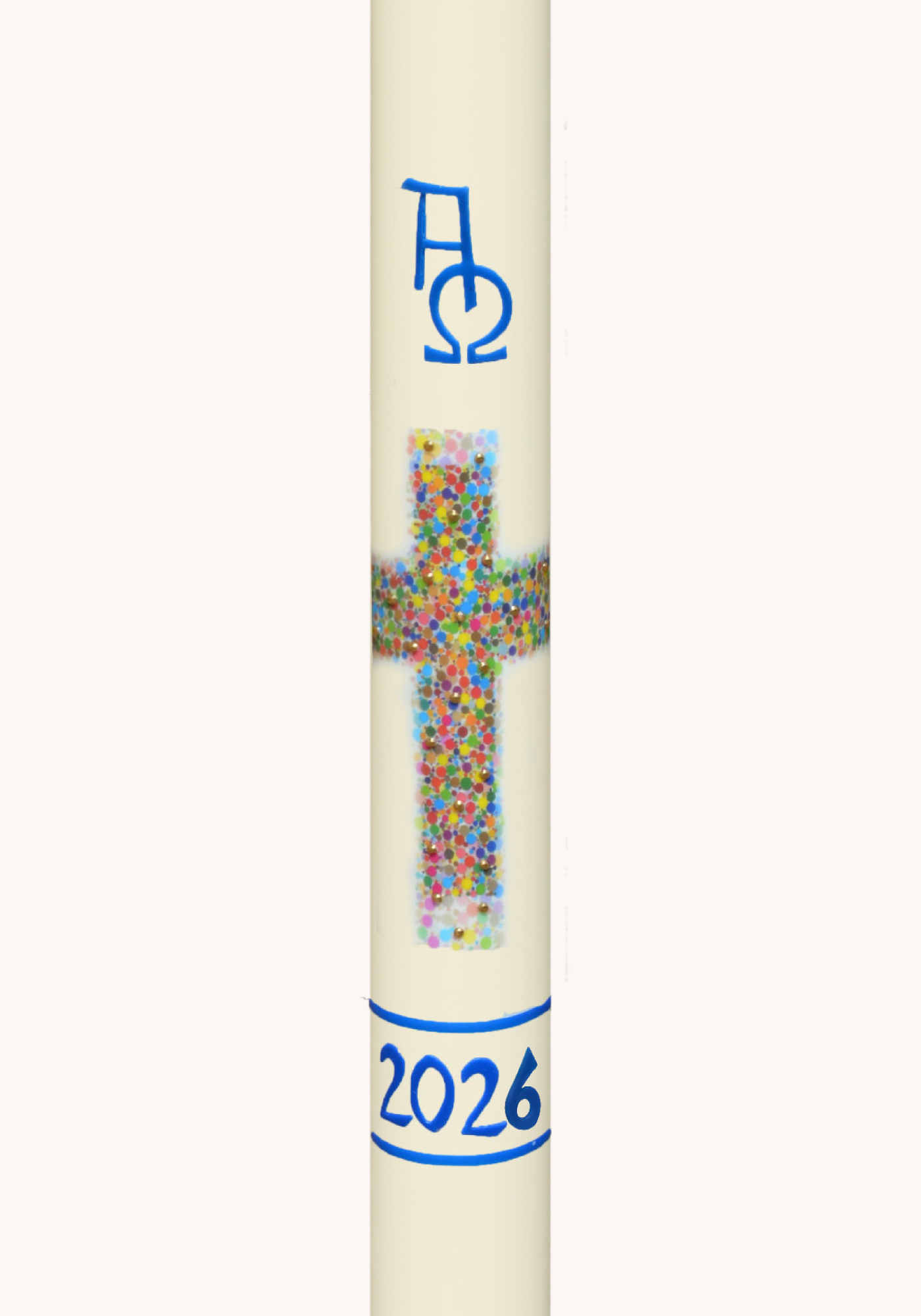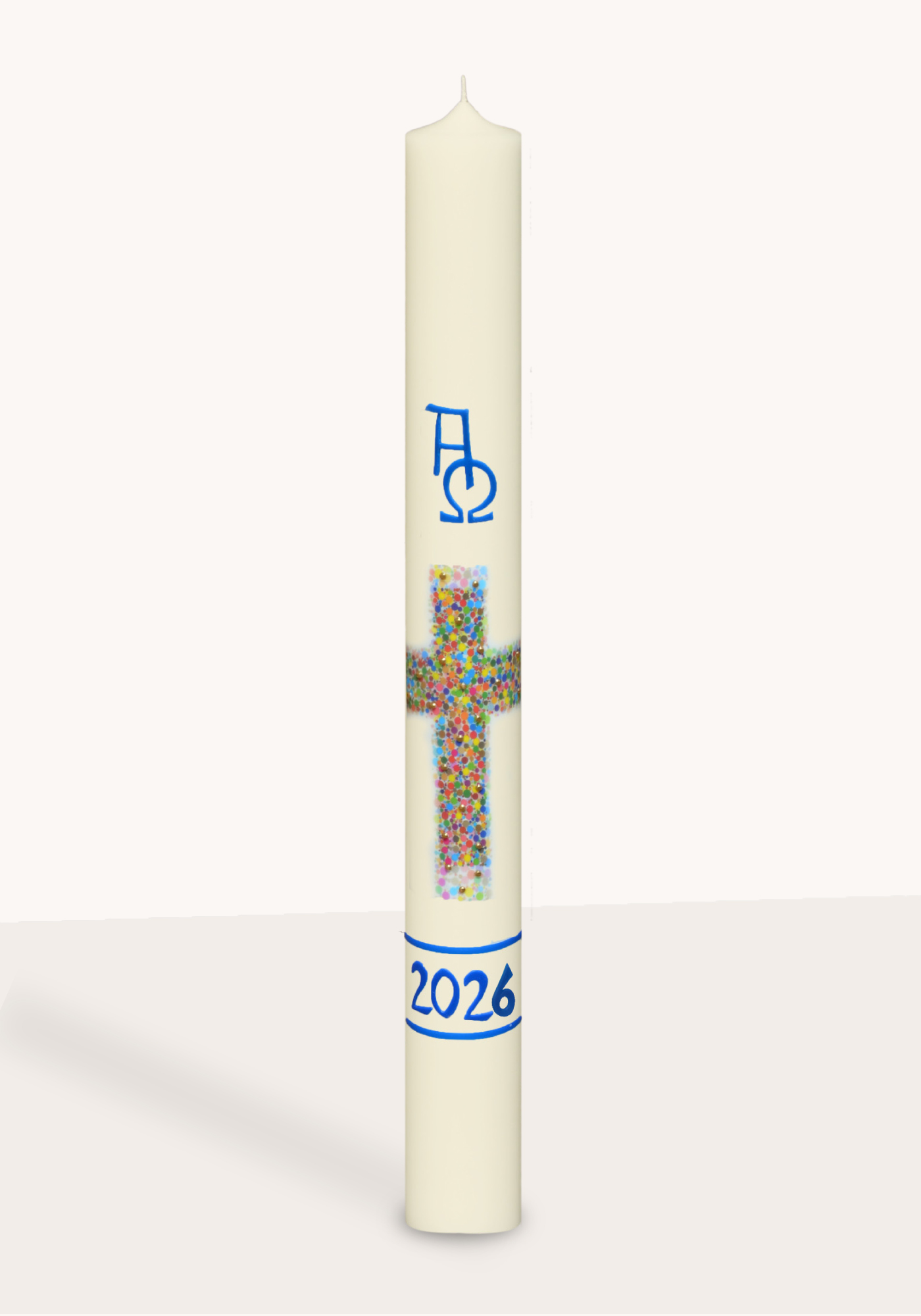 Das Motiv besticht durch ein farbenfrohes Kreuz, welches im Transferdruckverfahren angebracht und mit feinen Goldpunkten veredelt wurde. Das blaue Abschlussband aus Wachs sowie die ΑΩ-Symbole vollenden das christliche Design.