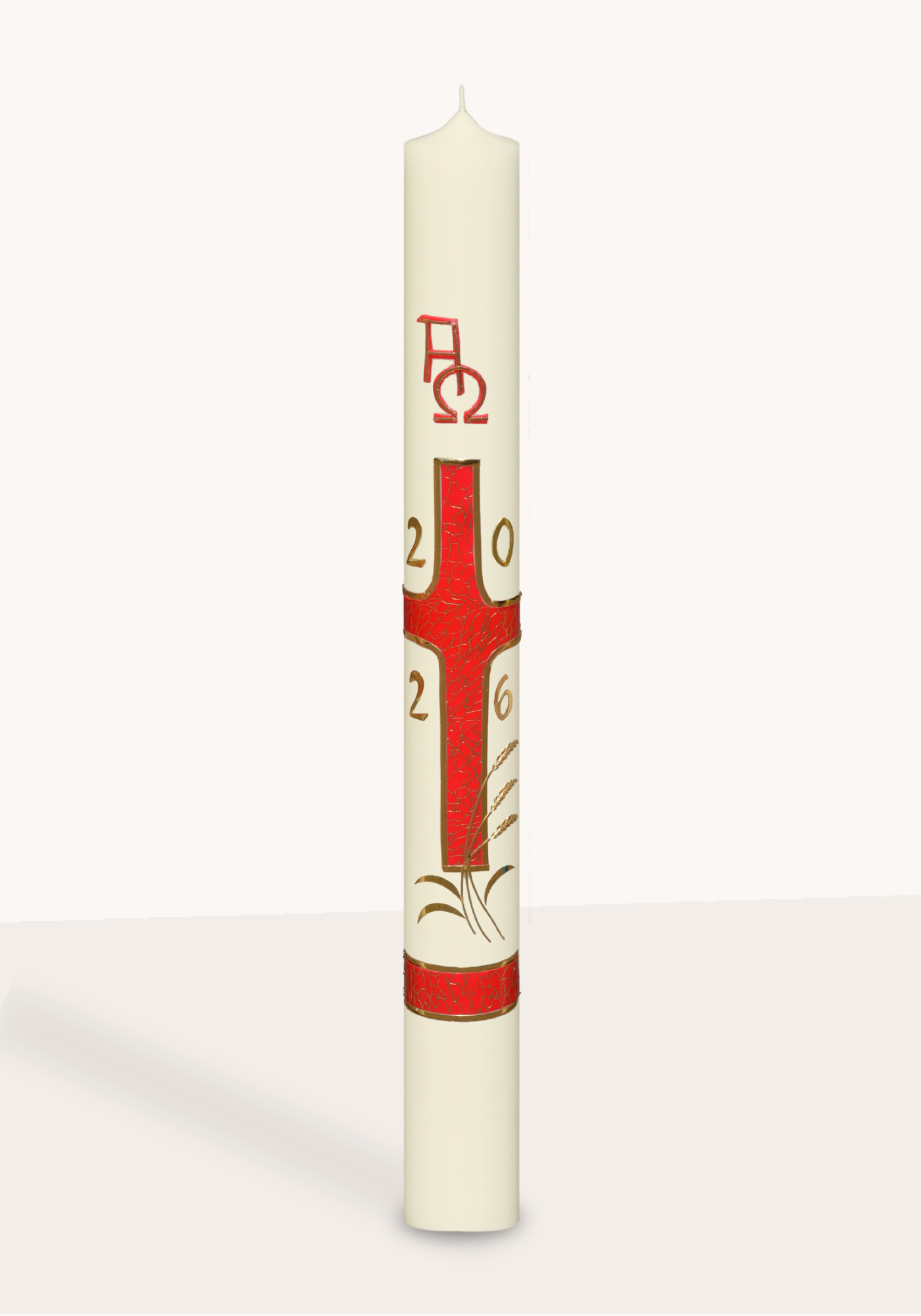 Das Motiv besticht durch ein leuchtend rotes, marmoriertes Wachskreuz, welches mit edlen Golddetails verfeinert wurde. Die goldene Ähre und das Abschlussband aus Wachs sowie die ΑΩ-Symbole vollenden das christliche Design.