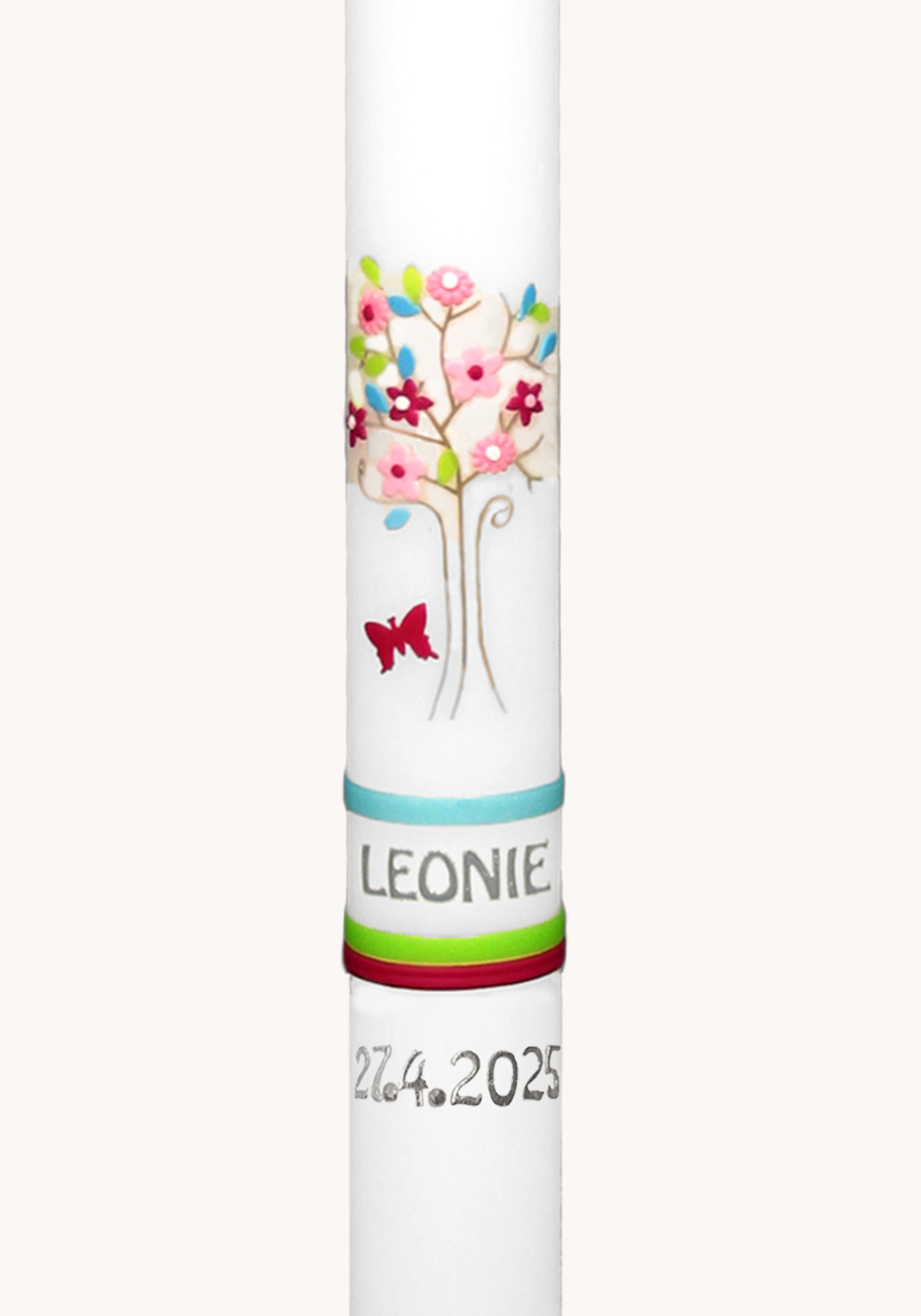 Taufkerze Motiv "Blütenbaum rosa" soll den Täufling ein Leben lang begleiten.